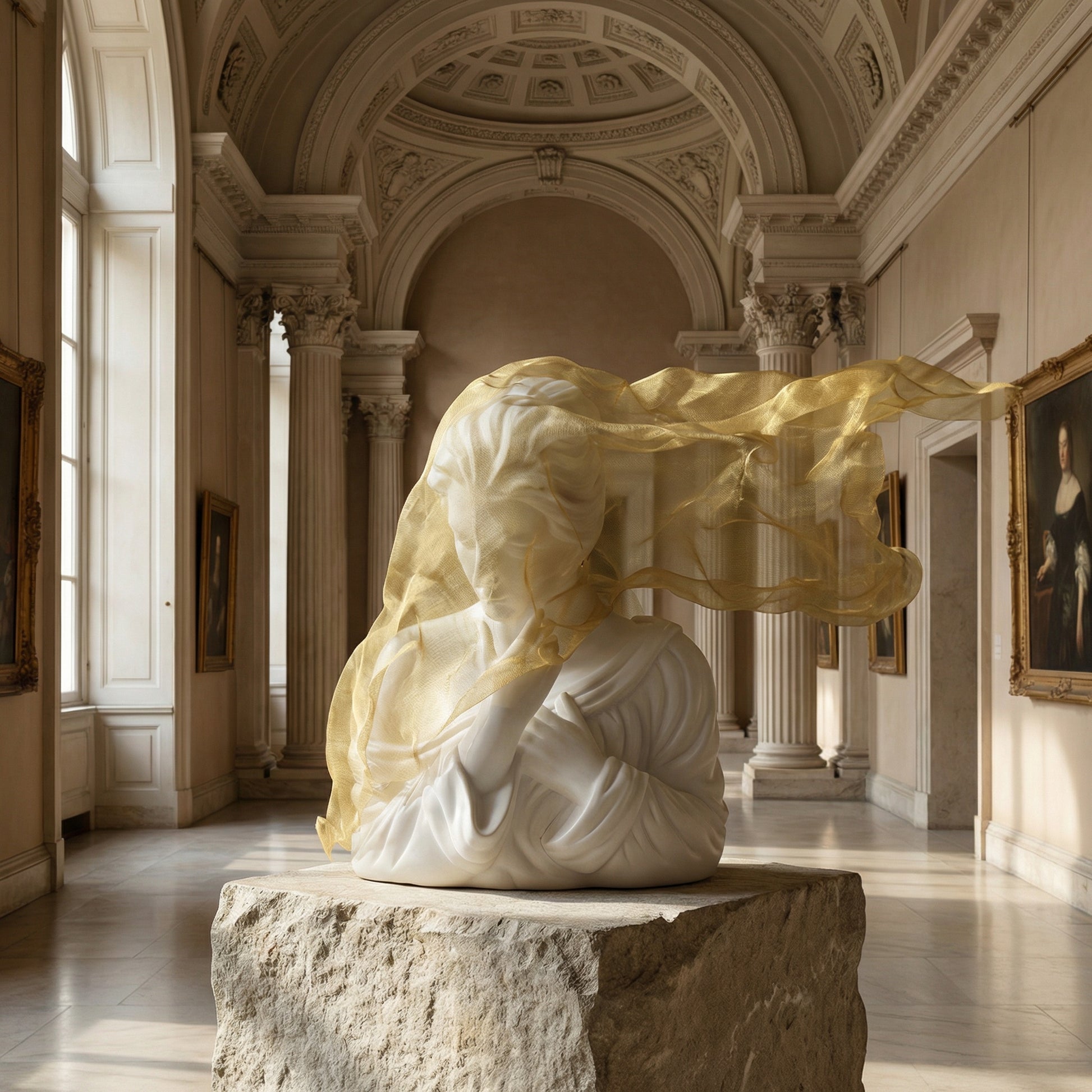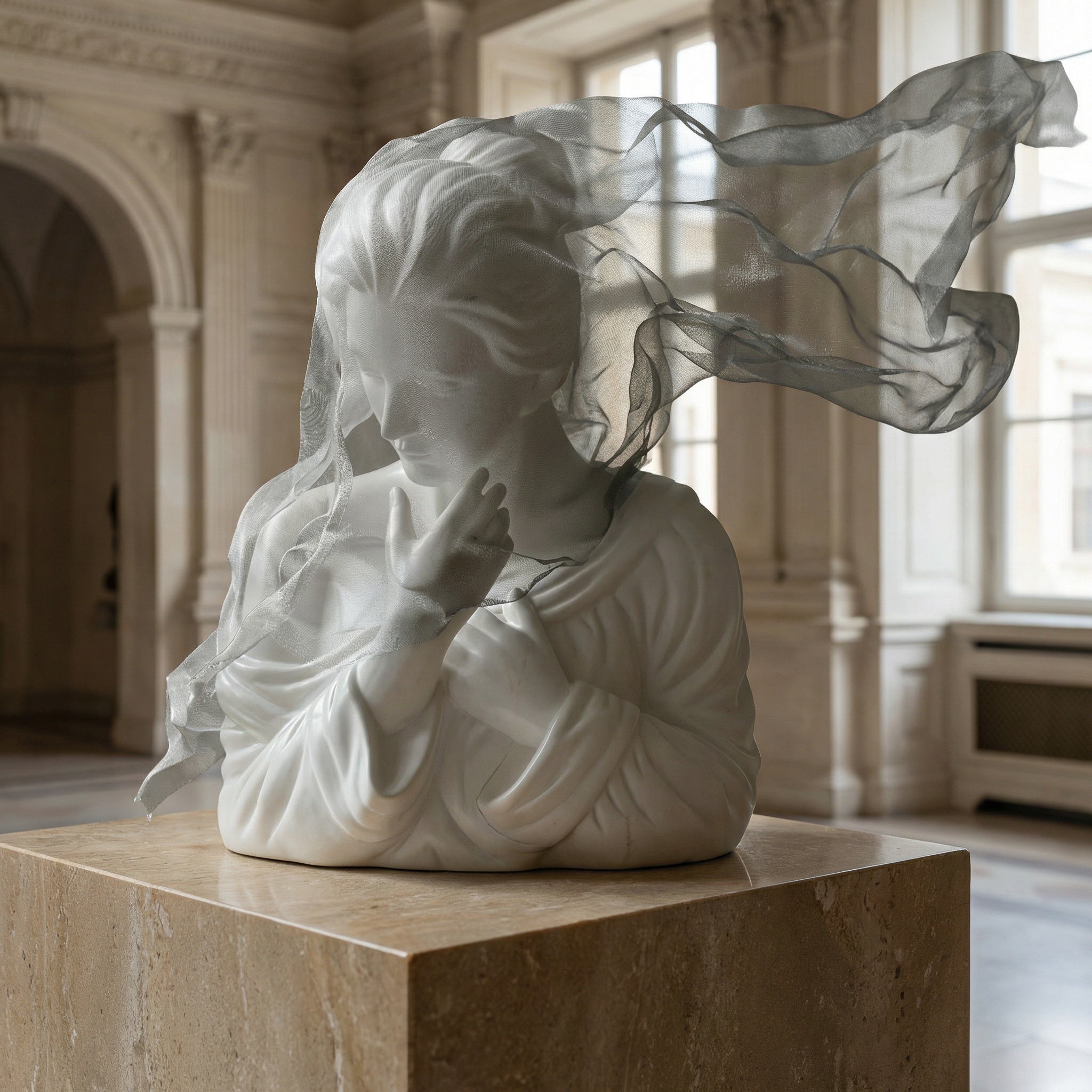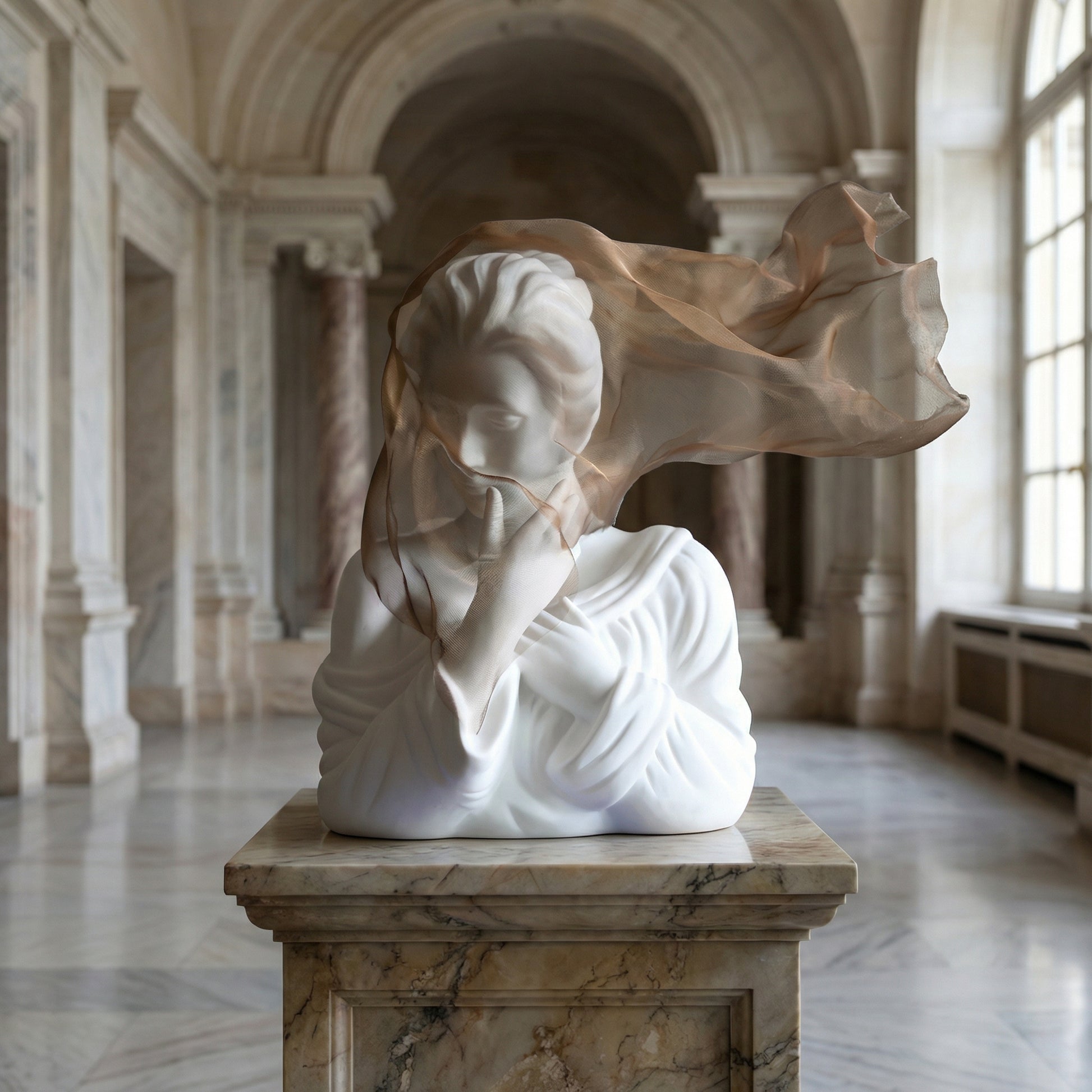 Where classical artistry meets modern luxury, La Nymphe de Marbre stands as a centerpiece worthy of the world's finest interiors. Inspired by the great European marble gardens — their lotus pools, silent fountains, and draped stone figures — this sculpture captures the impossible: the weightless fall of translucent fabric, forever frozen in form.