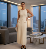 Featuring a sophisticated sleeveless cut and a graceful long silhouette, the dress accentuates the figure with fluid, flattering lines. Its minimalist design serves as the perfect canvas for every occasion, ensuring it’s the piece you reach for when you need instant polish.