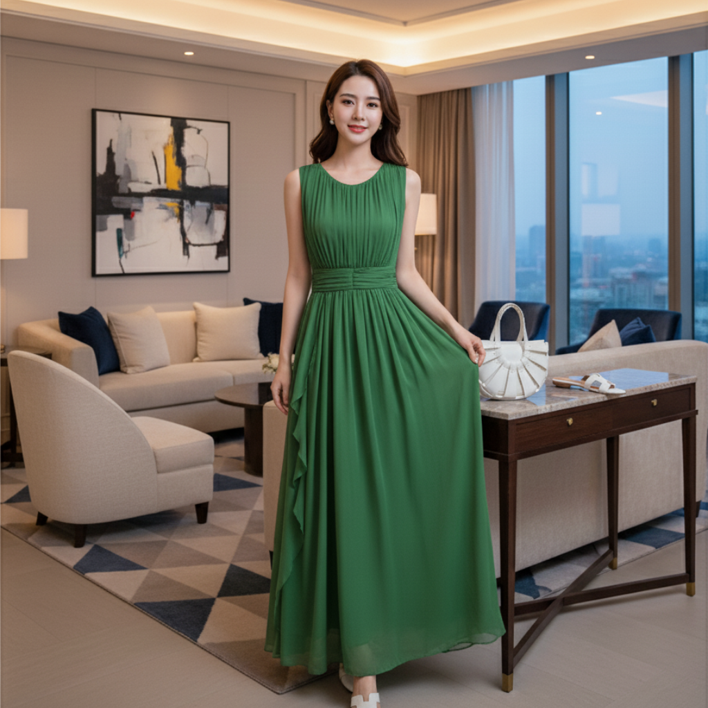 The design is meticulously constructed to flatter: a classic round neck provides a clean, elegant line, while the middle waist ensures a secure and universally flattering fit for a variety of body shapes. This vest and skirt combination creates a seamless, elongated silhouette that embodies pure refinement.